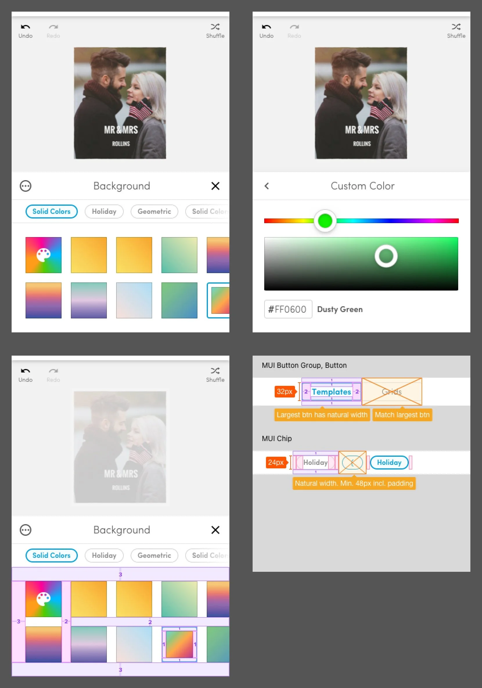 Our users could choose a variety of image backgrounds or colors for their designs. This UI categorized the available themes and provided precise color selection, either by touch or by color code.